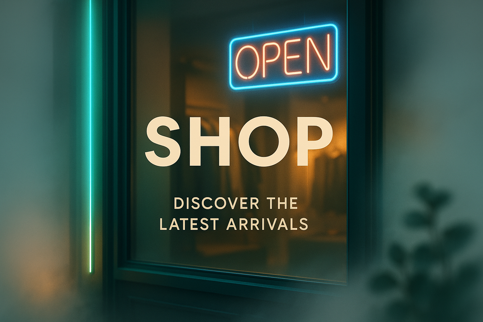 A vibrant neon shop window display featuring an 'OPEN' sign and the word 'SHOP.' The scene is illuminated with soft neon accents and hints of fog, creating a welcoming atmosphere.