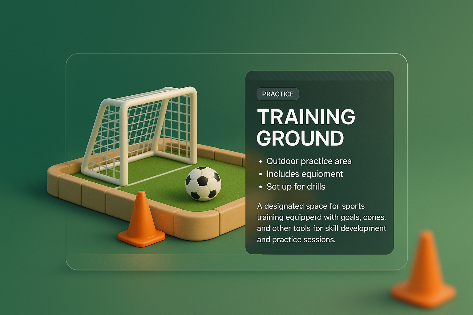 /Collection: /by davooda/Type: PNG/A visually appealing 3D illustration showcasing a training ground equipped with a soccer goal, cones, and a ball. The design features a smooth gradient background and layered elements for depth.