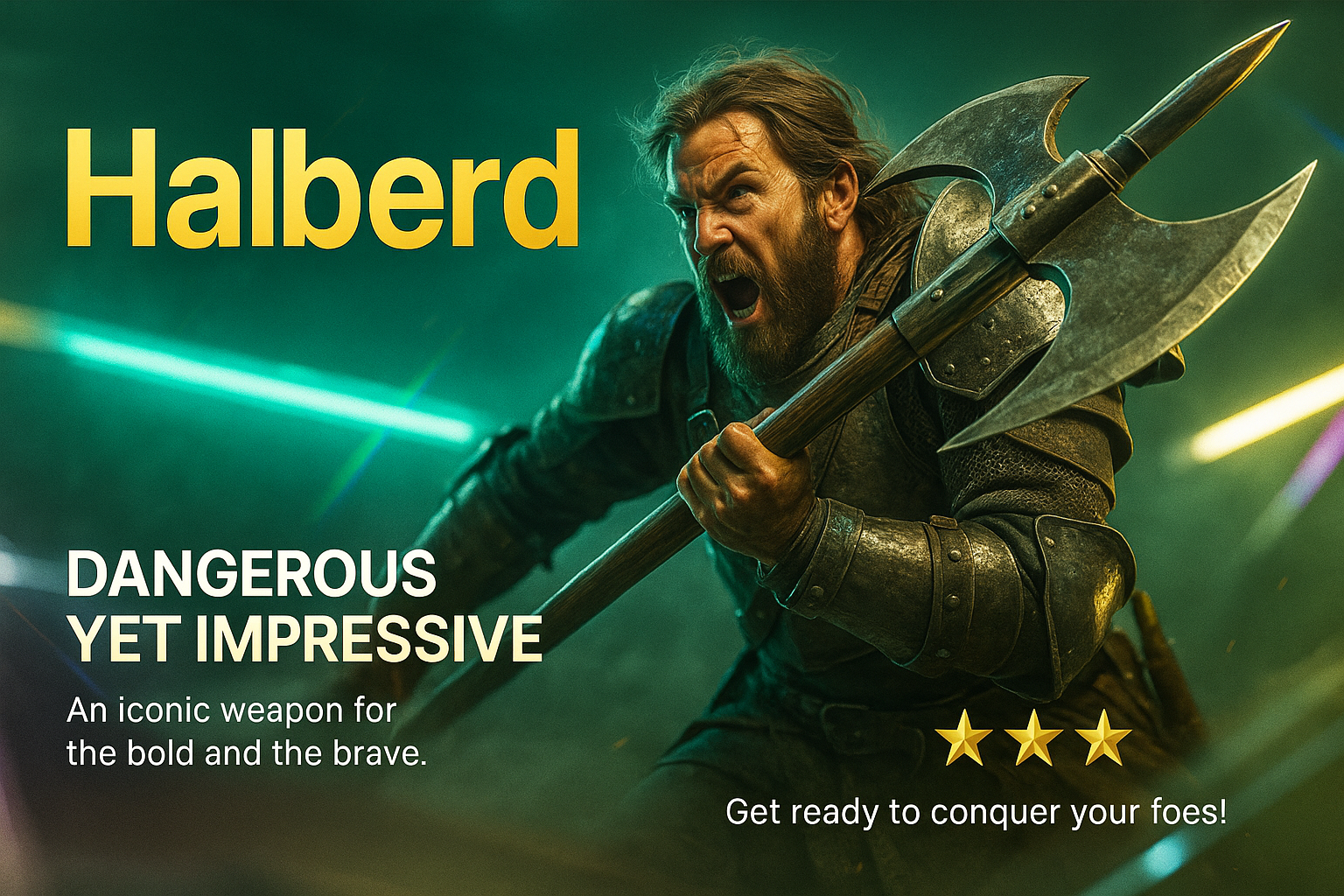 A striking advertisement featuring a warrior wielding a halberd, set against a neon-lit backdrop. The design showcases vibrant colors and dynamic text elements to engage viewers.