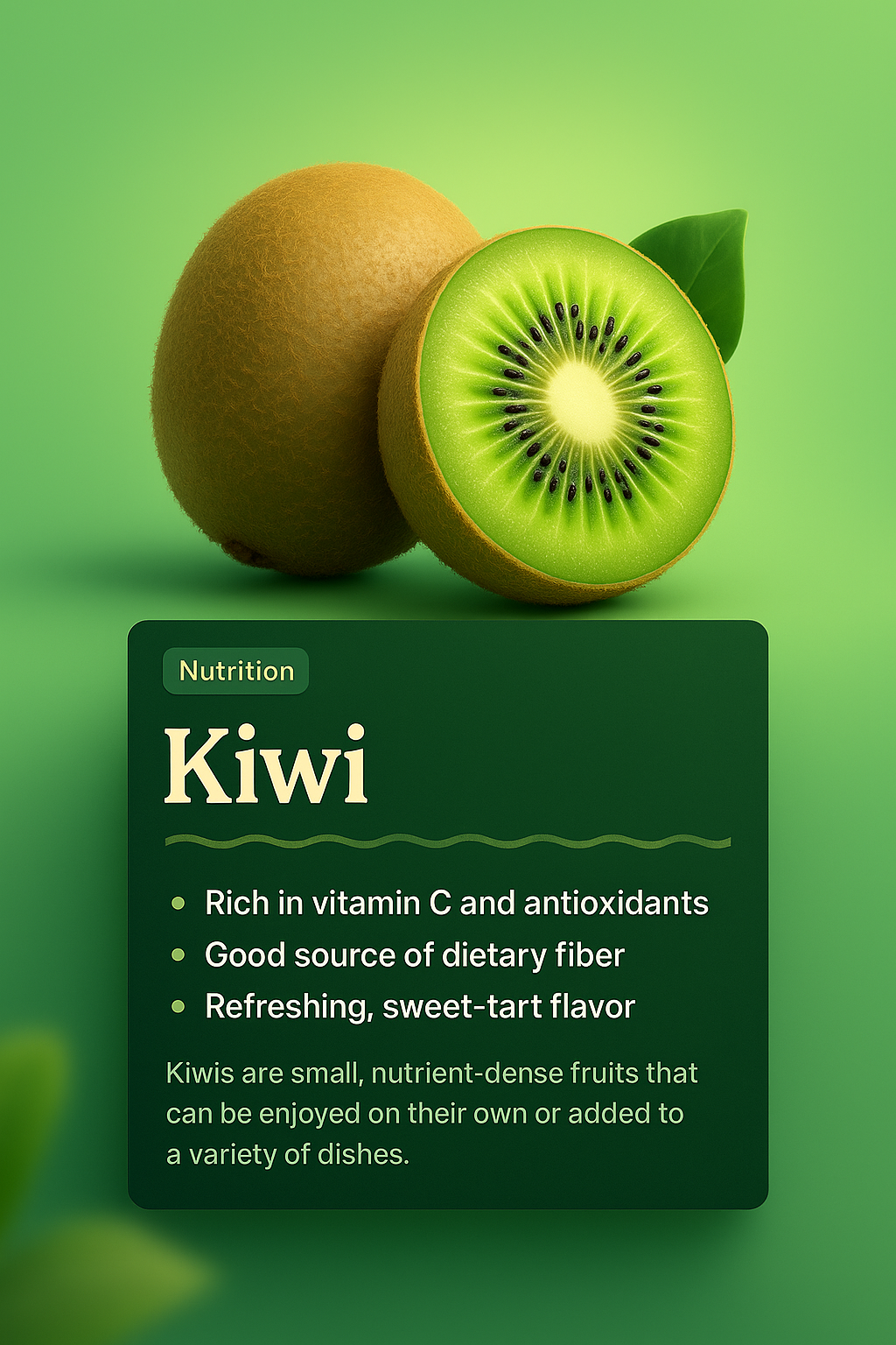 A vibrant 3D illustration of a kiwi fruit showcasing its internal structure. Accompanying text block highlights nutritional benefits with a green, cohesive design.