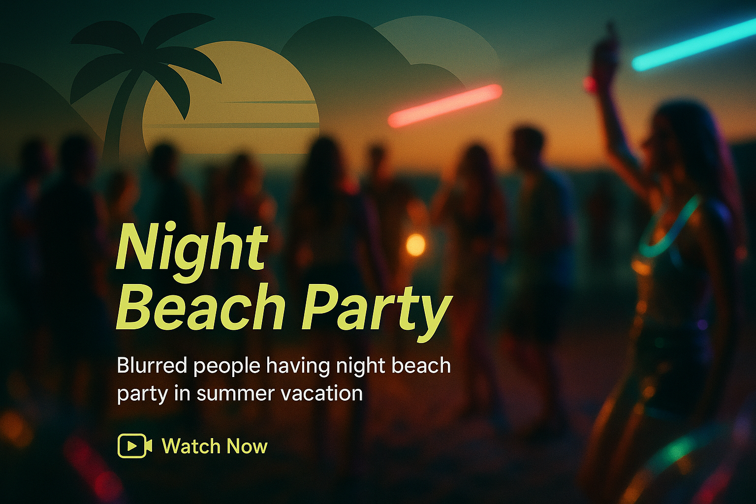 /Collection: /by davooda/Type: PNG/A lively summer night beach party scene featuring blurred figures enjoying the atmosphere, enhanced by colorful lights and a tropical backdrop, ideal for promotional or event-related content.
