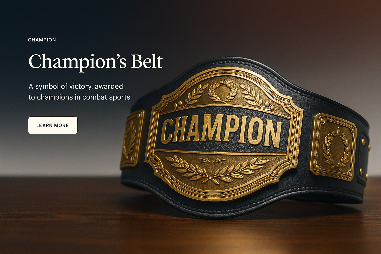 A stylish champion's belt with a black leather strap and gold embellishments, symbolizing victory in combat sports. Ideal for web page layouts with a modern design.