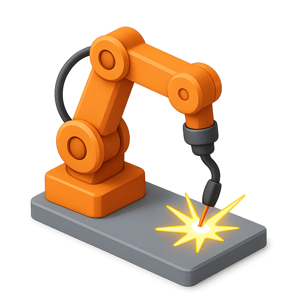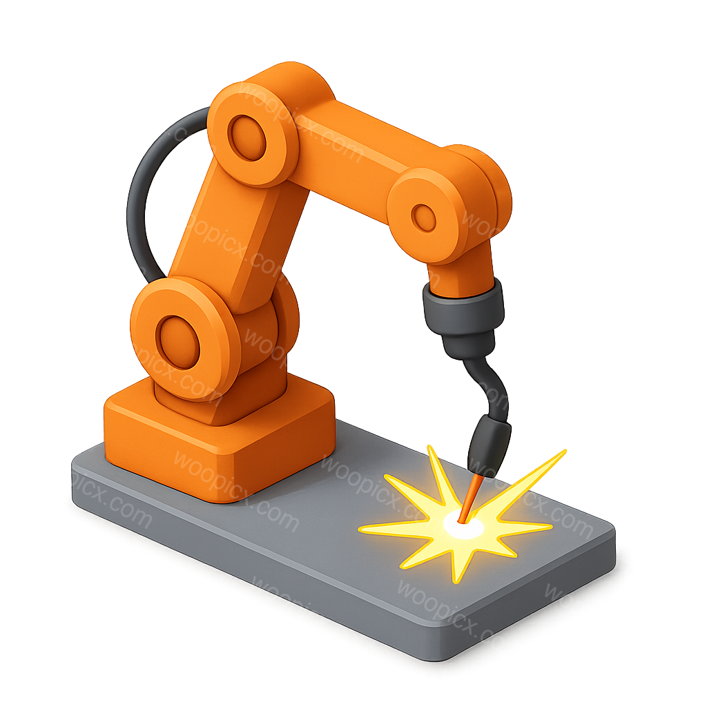 A vibrant 3D illustration of an orange robotic arm positioned over a gray base, emitting sparks as it performs a welding operation. The design is modern and visually striking, ideal for technology-related themes.