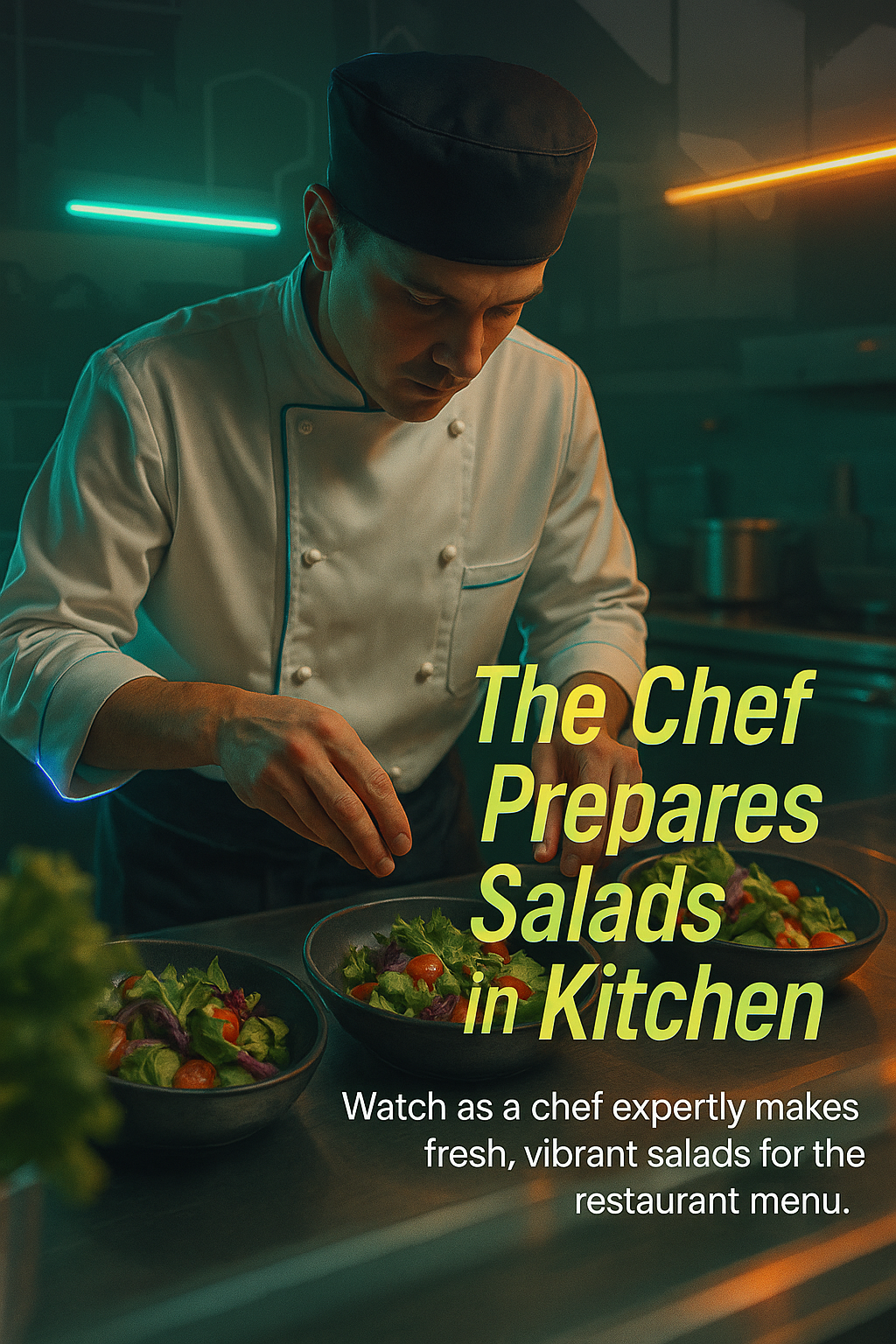 Dynamic kitchen scene showcasing a chef preparing fresh salads. The image captures the artistry of culinary preparation with a focus on vibrant ingredients, ideal for food-related content.