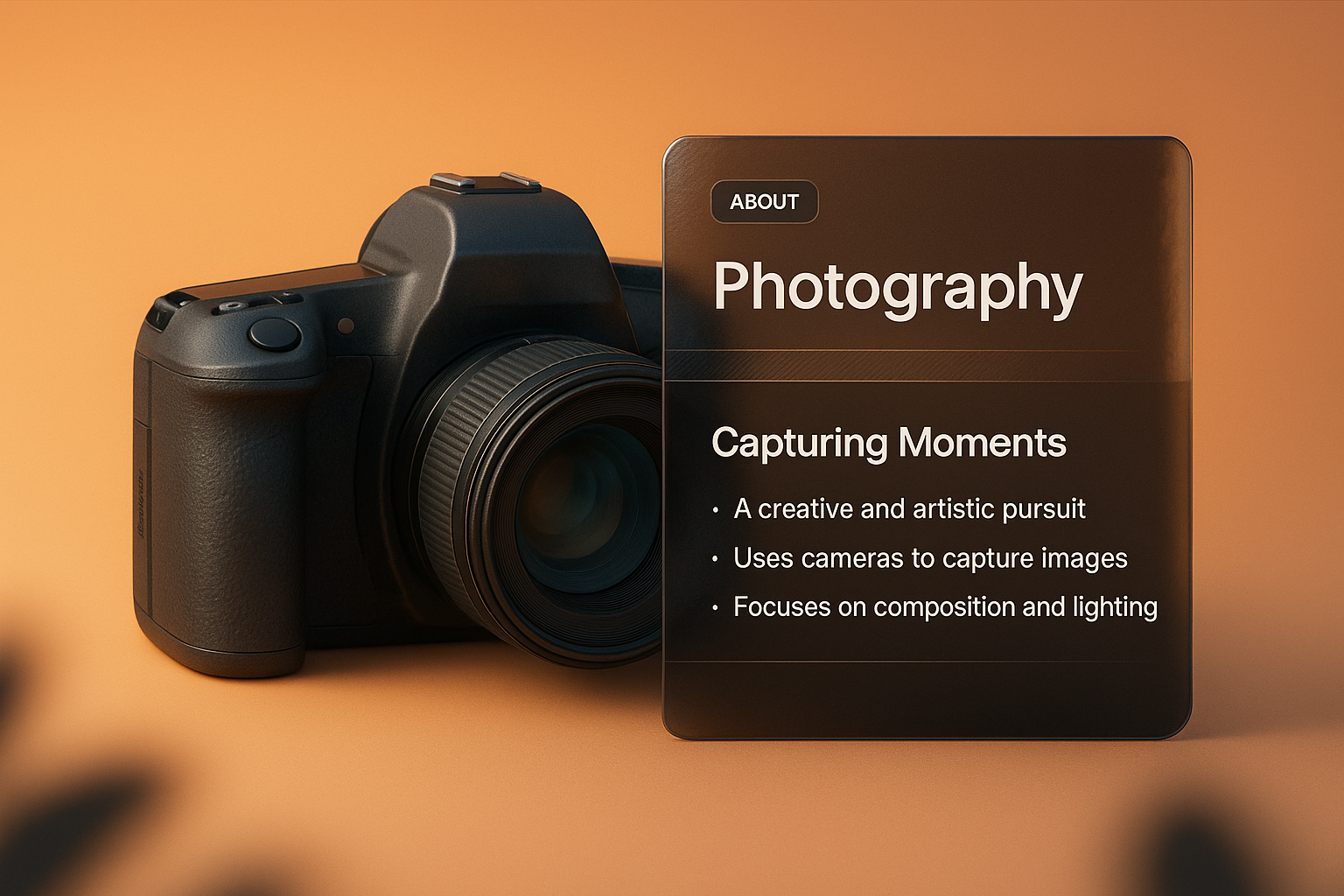 A striking 3D illustration showcasing a camera with a sleek, dark transparent panel containing text about photography, highlighting its artistic pursuit.