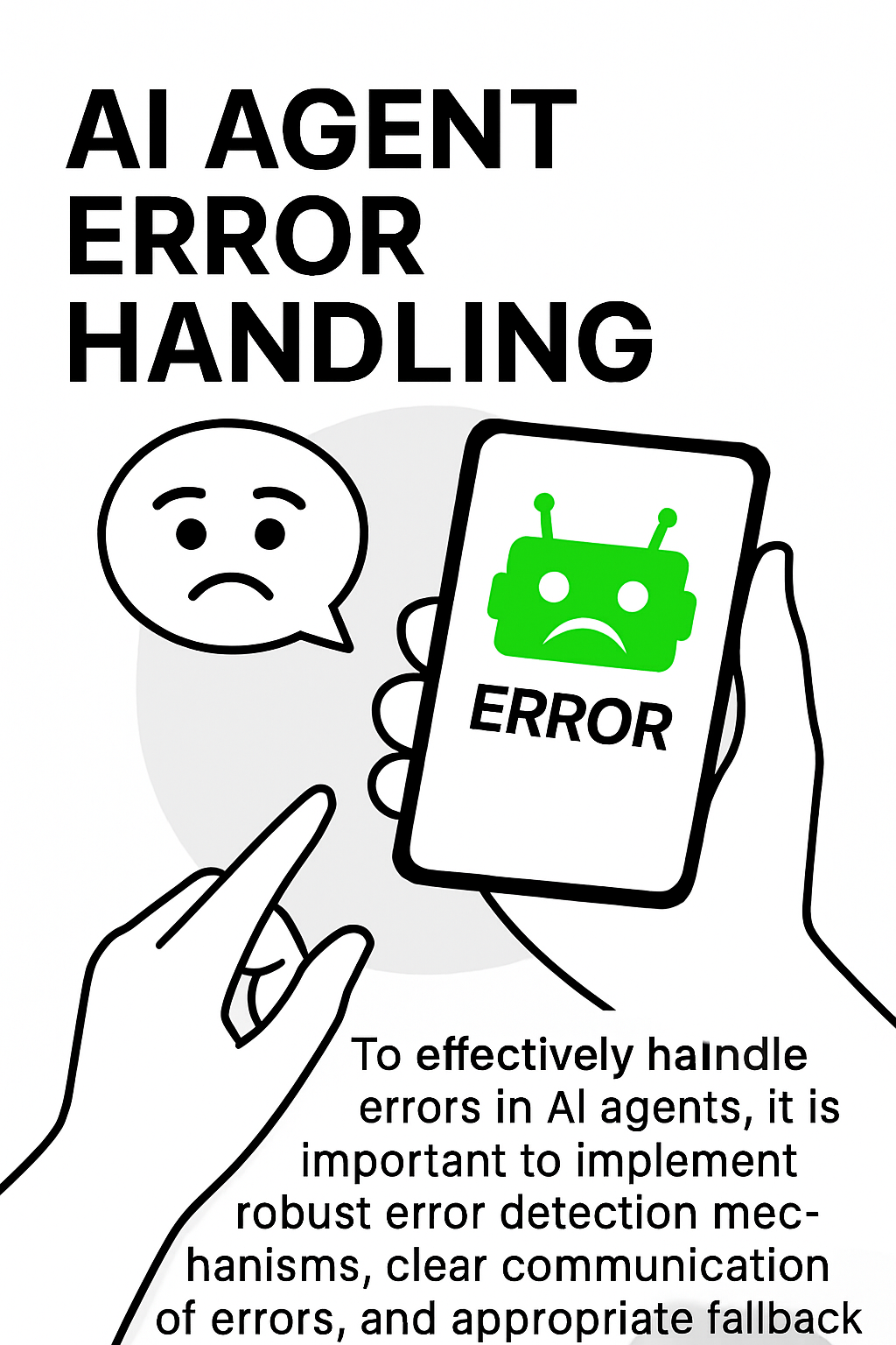 A minimalist infographic detailing error handling in AI agents, featuring a smartphone illustration with an error symbol, aimed at tech professionals and developers.