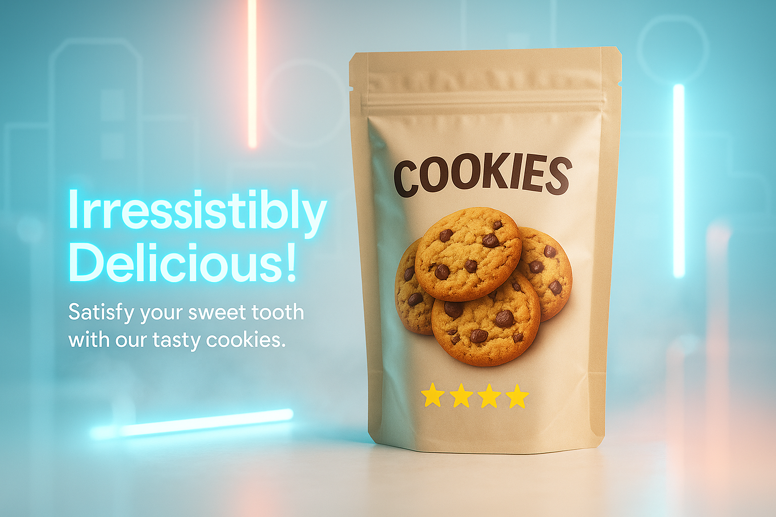 Stylish product packaging design for cookies featuring appealing visuals and modern design elements, ideal for e-commerce marketing and food promotion.