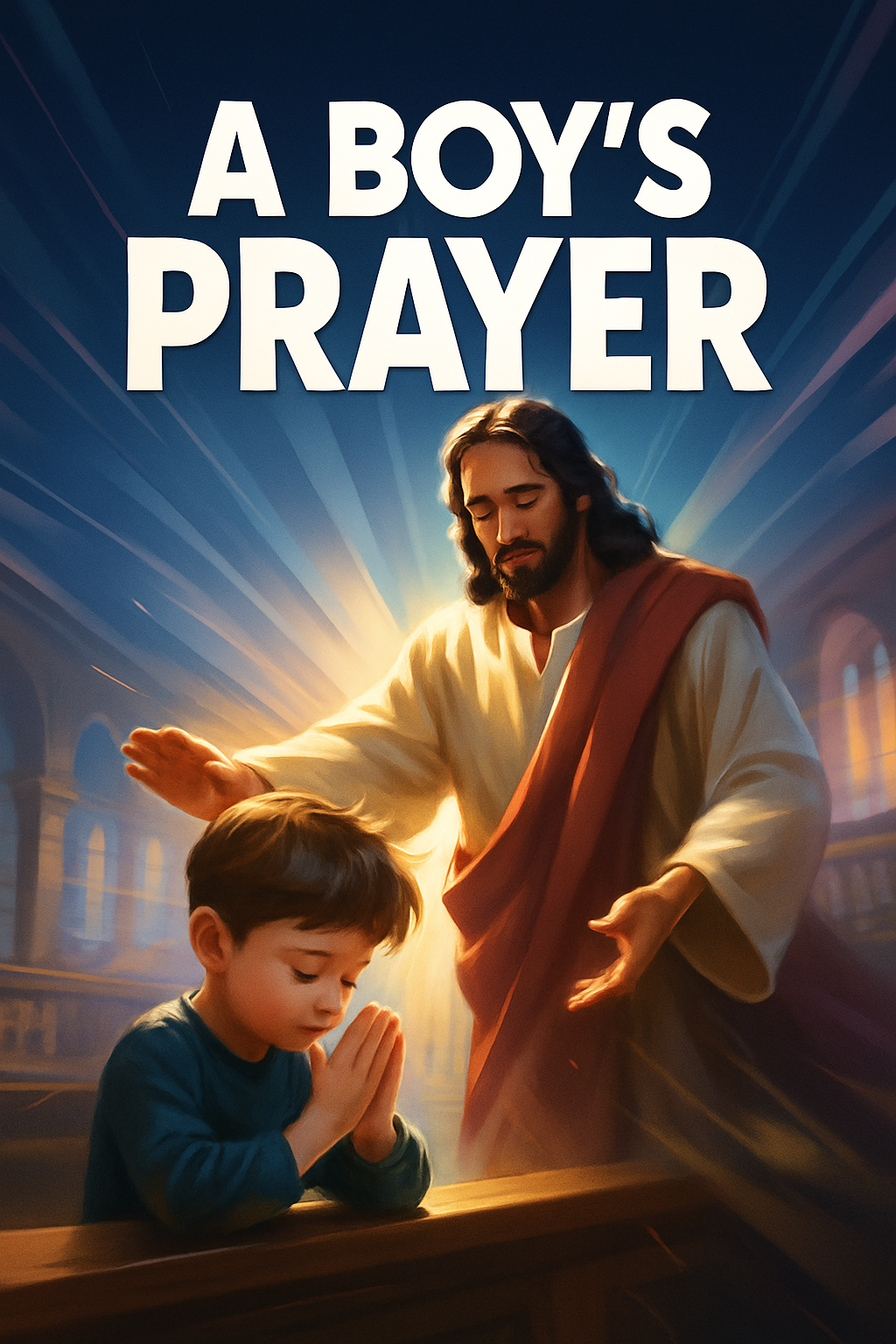 A touching scene of a small boy praying in a church, with Jesus extending a blessing. The dynamic lighting and composition create an inspiring atmosphere.