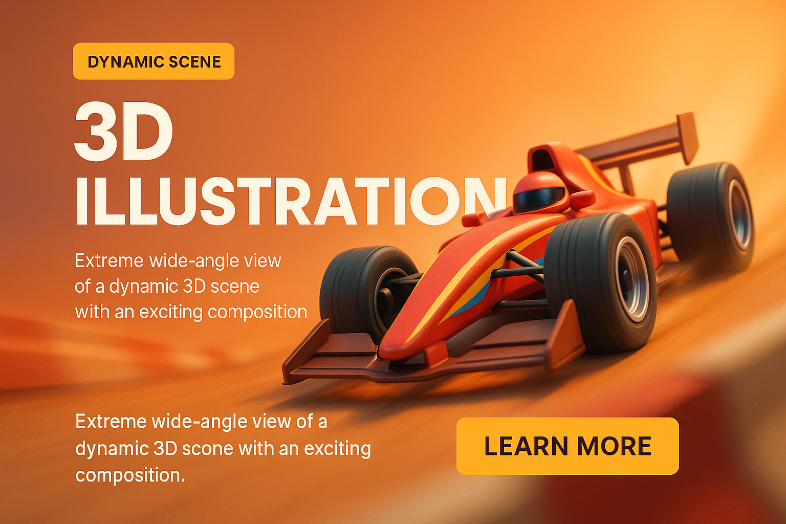 Vibrant 3D illustration showcasing a racing car in a dynamic scene. Ideal for promotional use in digital advertising or web content.