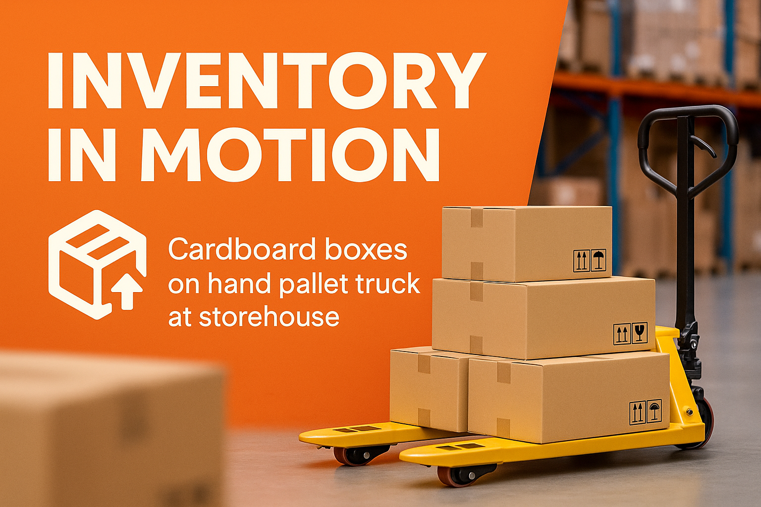 A vibrant promotional image showcasing a hand pallet truck loaded with cardboard boxes in a storage facility, ideal for inventory management themes.