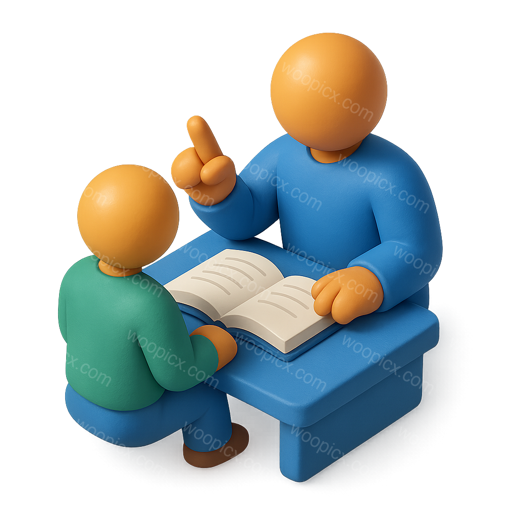 A colorful 3D icon illustrating a mentorship scene with two figures, one teaching a child at a table with an open book. The design features a transparent background and a volumetric isometric perspective.