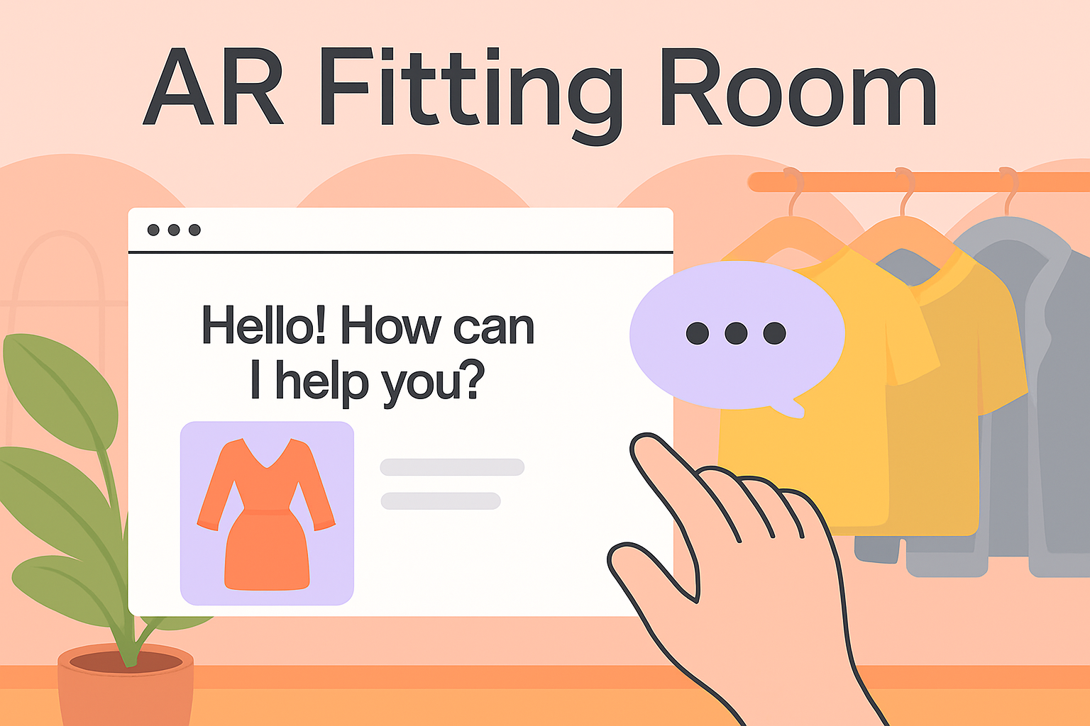 /Collection: /by Sergey Leonov/Type: PNG/Illustrative graphic depicting a virtual fitting room with interactive elements, showcasing a hand reaching out to a chat interface, ideal for e-commerce and tech marketing.