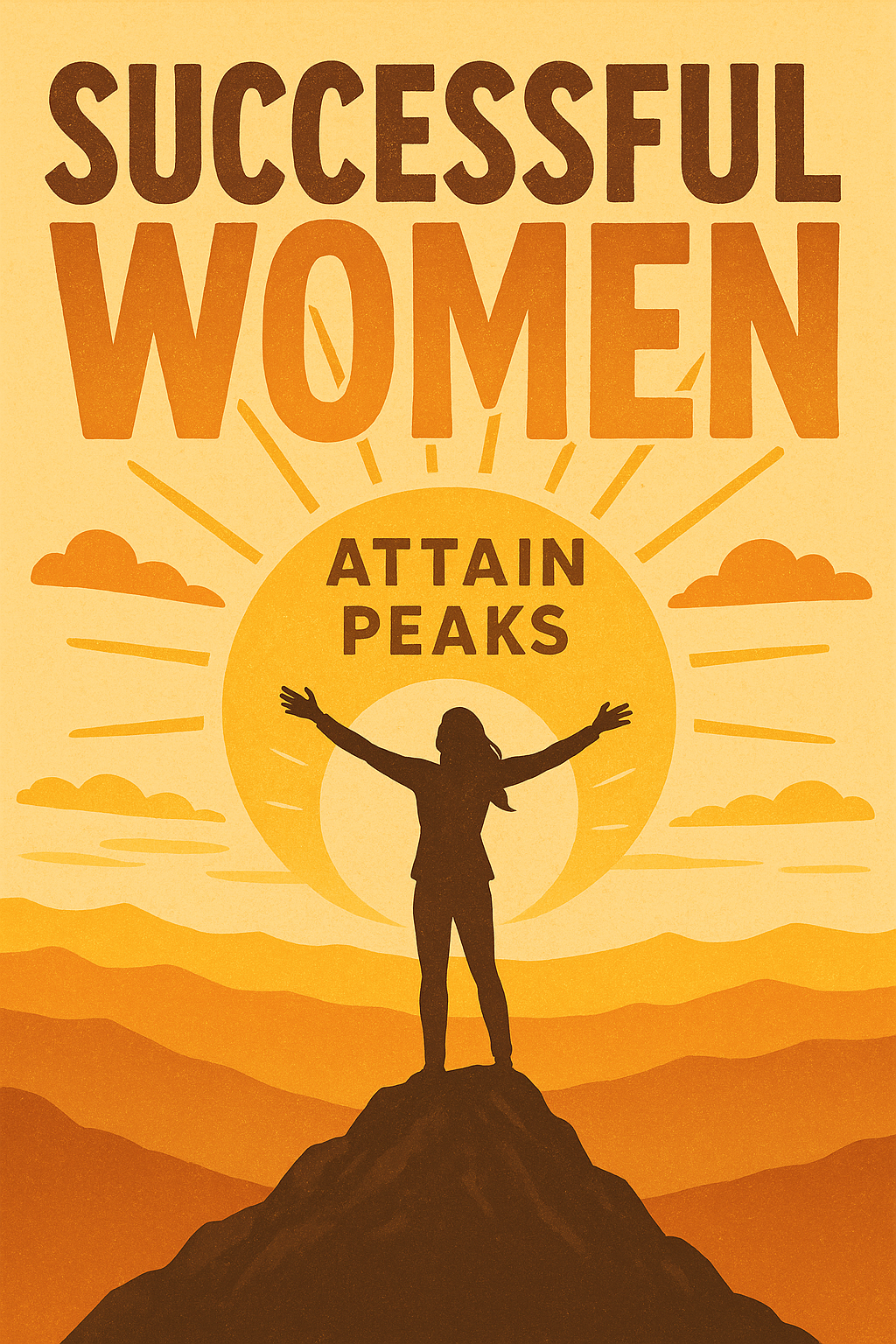 A motivational poster showcasing a silhouette of a woman triumphantly standing on a peak against a vibrant sunset background, designed to inspire and empower.