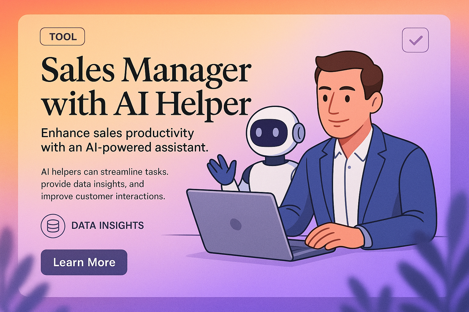 A visually appealing landing page design showcasing a Sales Manager working with an AI assistant. The layout includes a bright gradient background, engaging typography, and interactive elements.