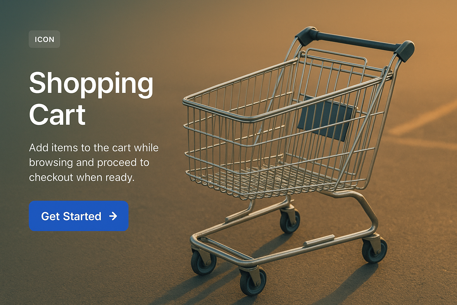 /Collection: /by davooda/Type: PNG/A realistic shopping cart icon displayed against a simple gradient background. It features a clear call-to-action button and text, ideal for e-commerce web design.