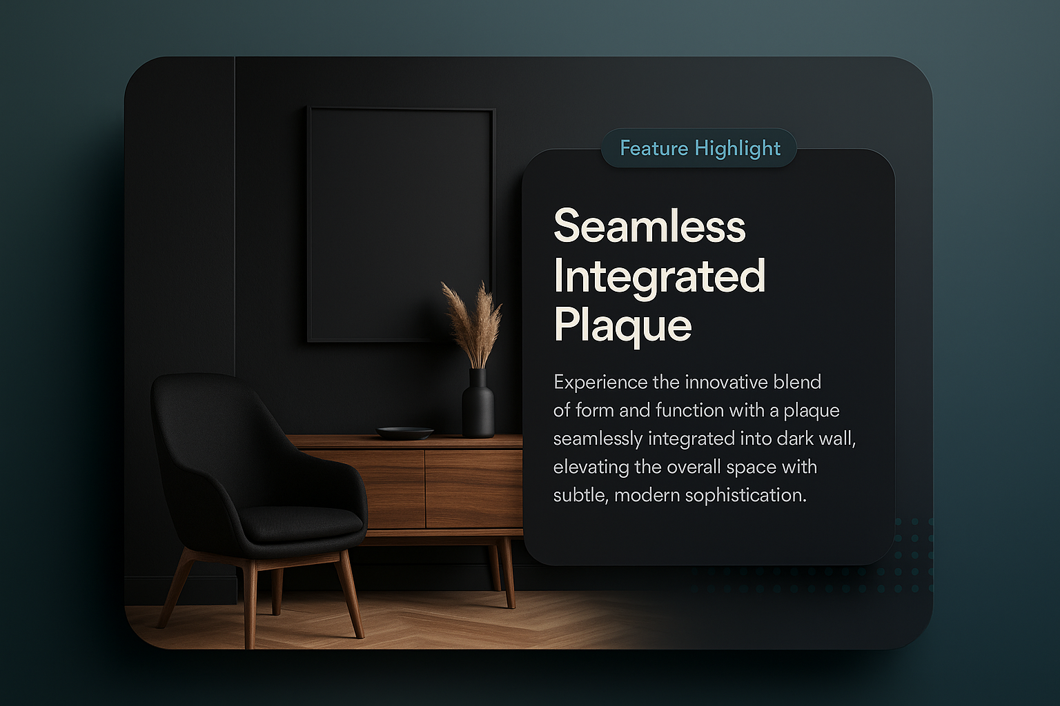 /Collection: /by davooda/Type: PNG/A sophisticated living room interior featuring black walls, elegant furniture, and a seamlessly integrated design plaque. The atmosphere embodies modern luxury with a focus on form and function.