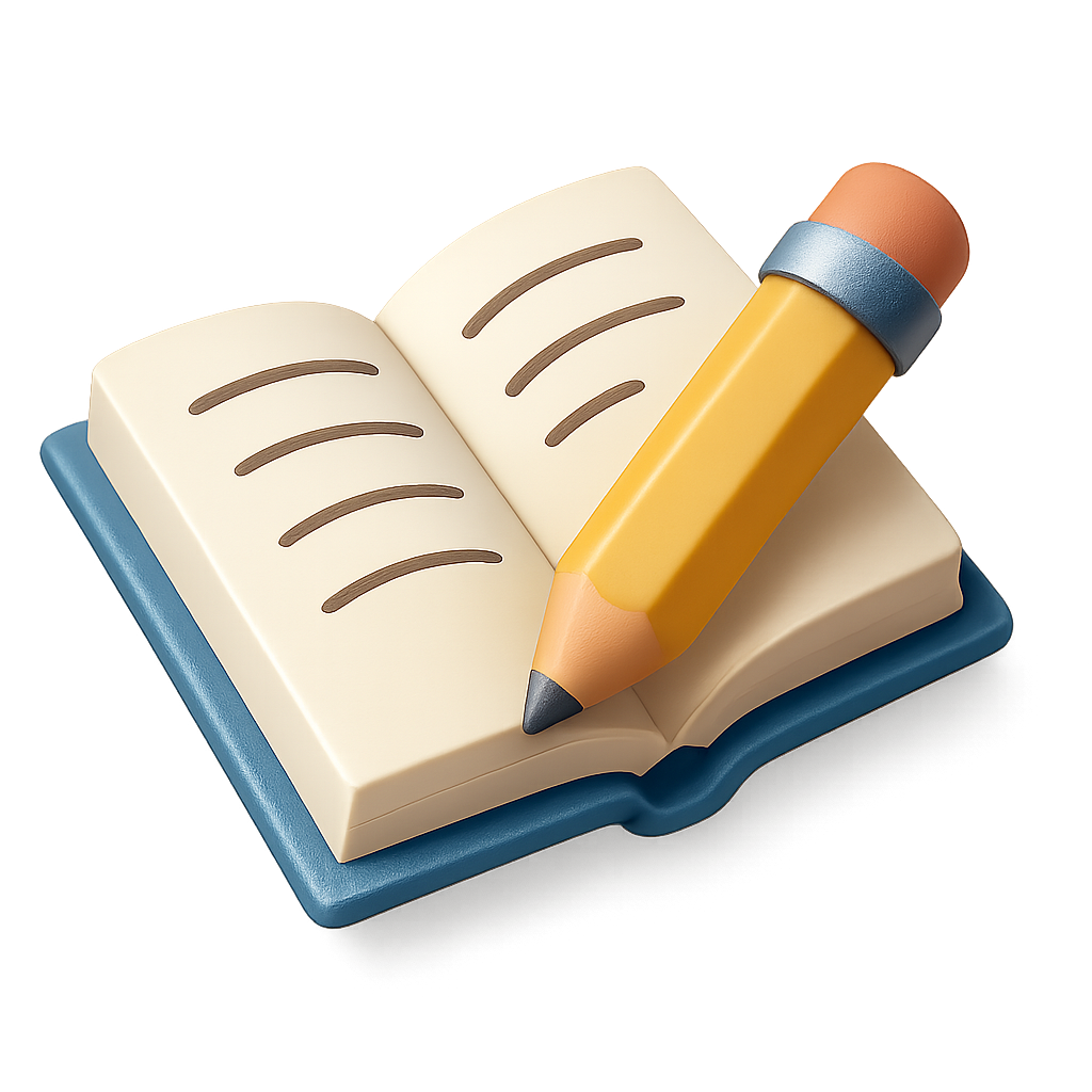 This 3D icon depicts an open book with a pencil resting on it, showcasing a clear, isometric design. The book features lines on the pages, and the pencil has a vibrant color scheme.