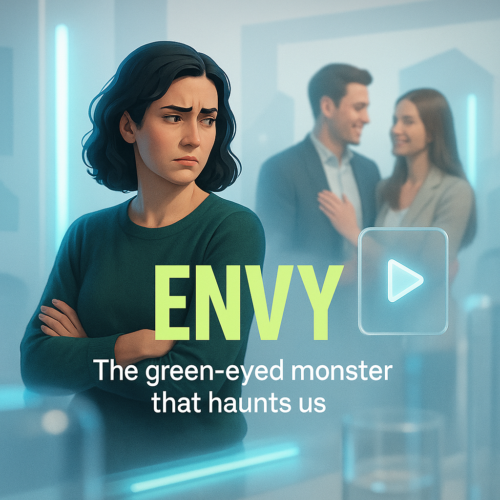 /Collection: /by davooda/Type: PNG/A visually compelling illustration portraying the theme of envy, featuring a contemplative woman in a modern setting. The design uses a soft color palette and contrasting elements to evoke emotional resonance, suitable for mental health discussions.