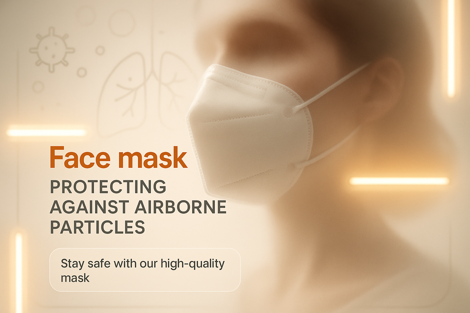 /Collection: /by davooda/Type: PNG/A visually appealing promotional image featuring a model wearing a face mask, highlighting safety against airborne particles. The soft focus and modern design elements make it suitable for health campaigns.