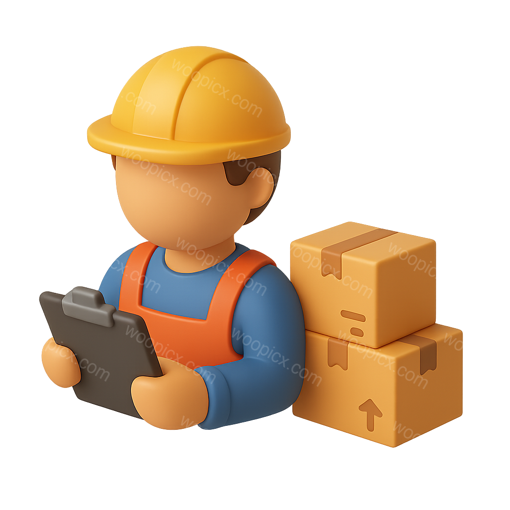 A 3D icon of a warehouse worker in a hard hat, holding a clipboard. The character stands next to stacked boxes, creating a volumetric and isometric look.