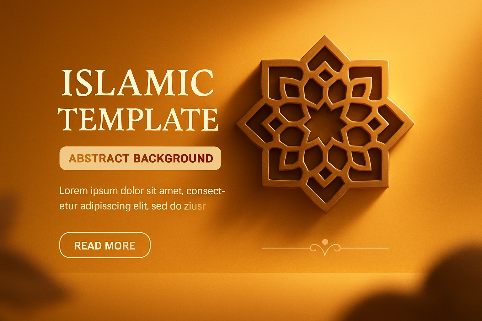 This image features an abstract background with an Islamic geometric design element, suitable for digital templates or promotional materials. The warm tones and shadowing create depth.