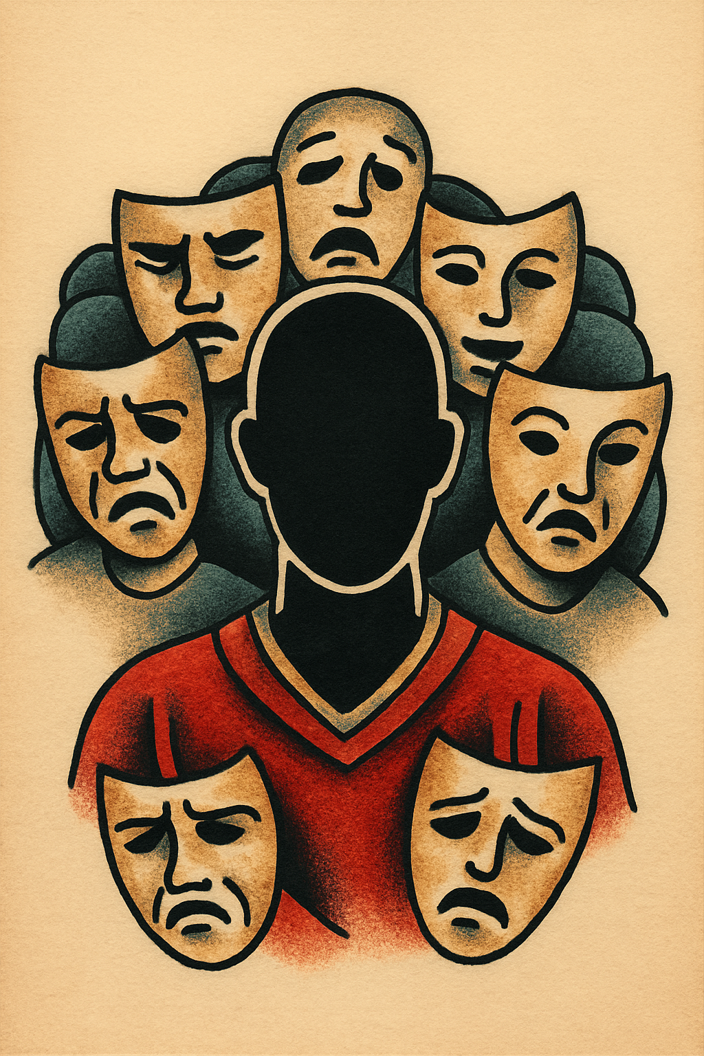 An artistic representation of a faceless silhouette surrounded by various expressive masks. The design features a classic tattoo style with multiple colors on a soft beige background.