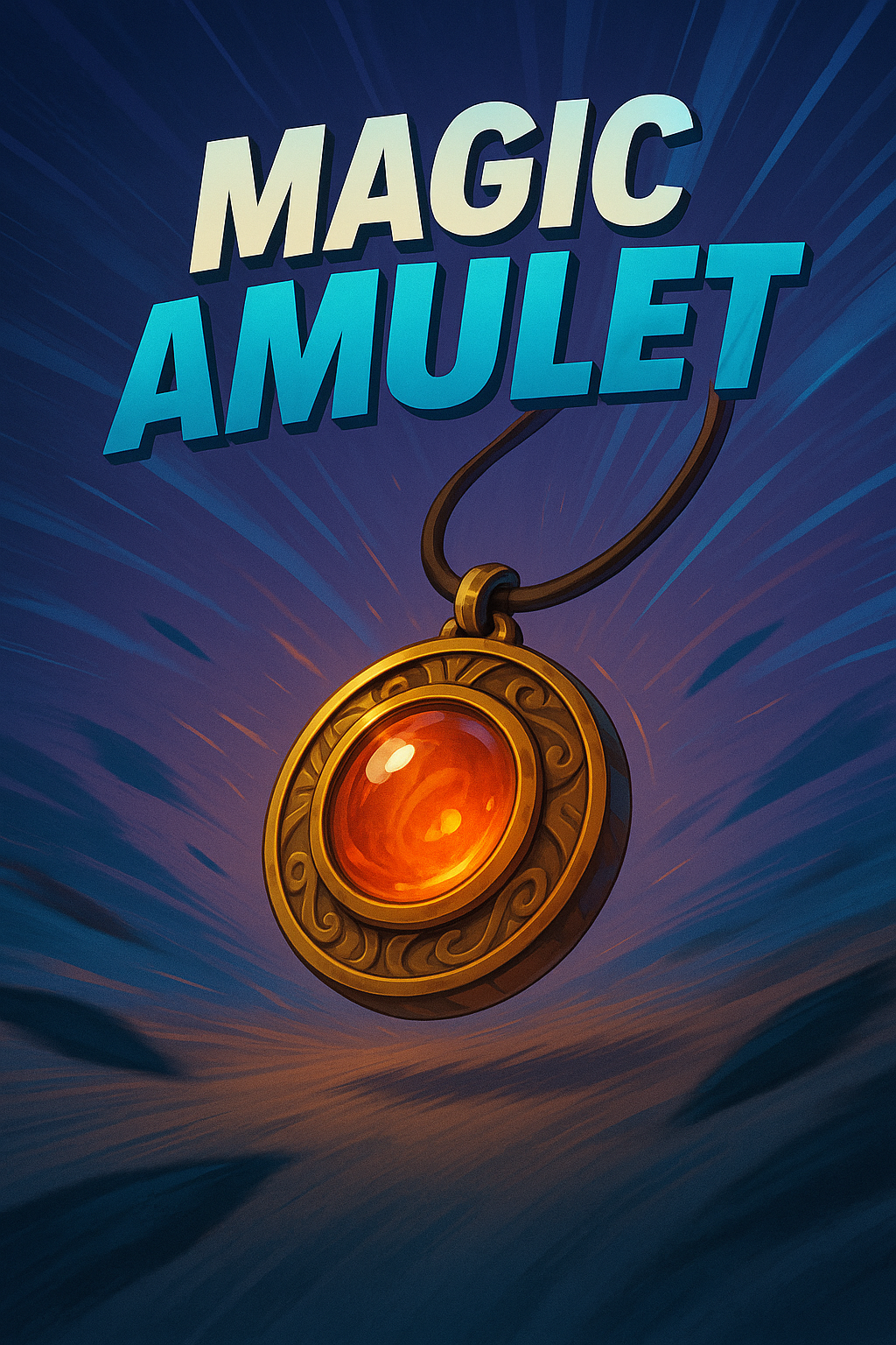A vibrant and dynamic depiction of a magic amulet, featuring bold typography. The amulet hangs from a string, radiating energy with a smooth gradient background.