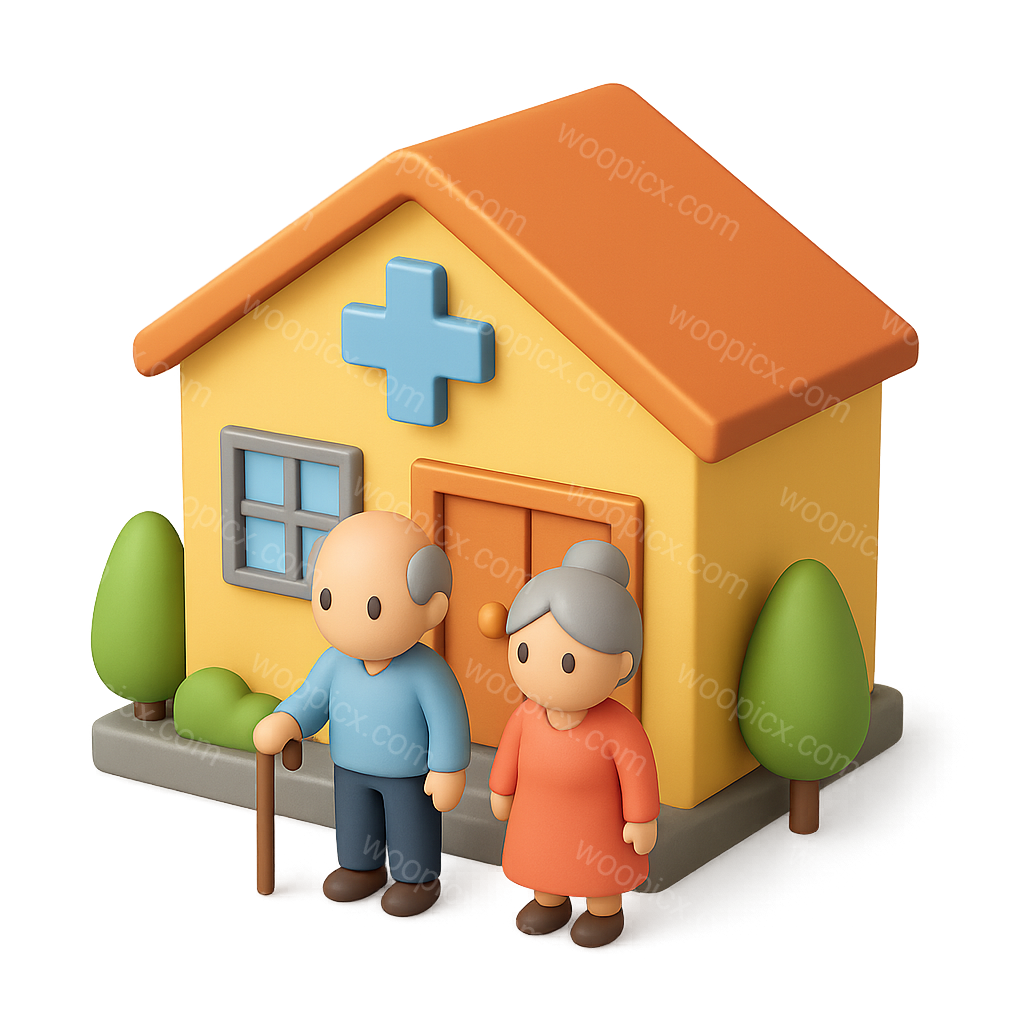 /Premium/Collection: /by davooda/Type: PNG/A vibrant 3D icon depicting an assisted living facility, featuring an elderly couple standing in front of a colorful house with trees, showcasing a warm and welcoming atmosphere.