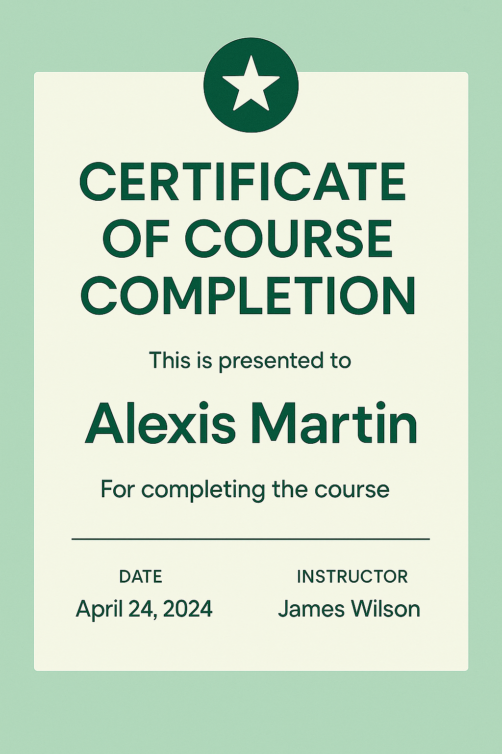 Formal certificate showcasing course completion with a clean and modern design. Ideal for educational institutions and online courses to recognize achievements.