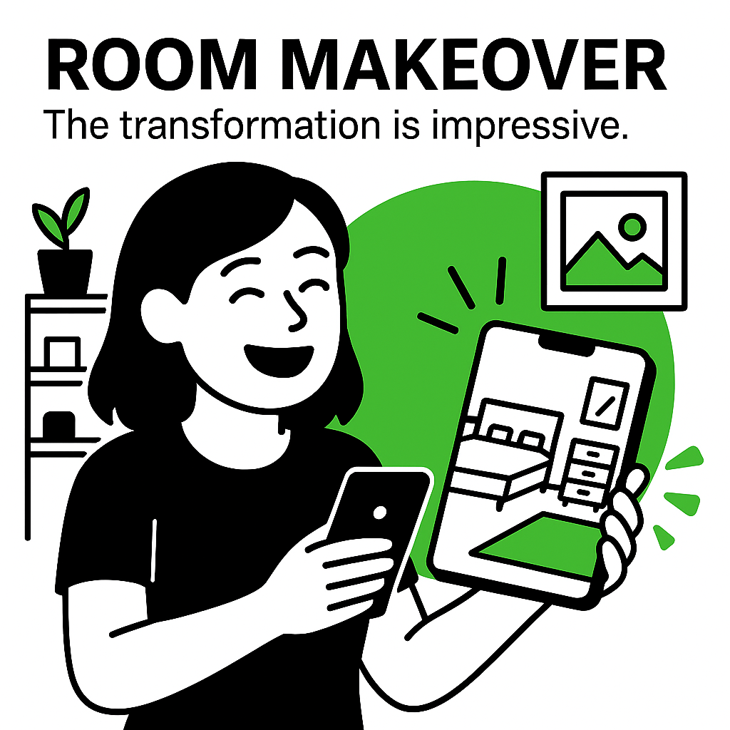 /Collection: /by davooda/Type: PNG/Stylized graphic depicting a person showcasing a room transformation on a smartphone. The design features bold lines and vibrant colors, suitable for home improvement or interior design promotions.