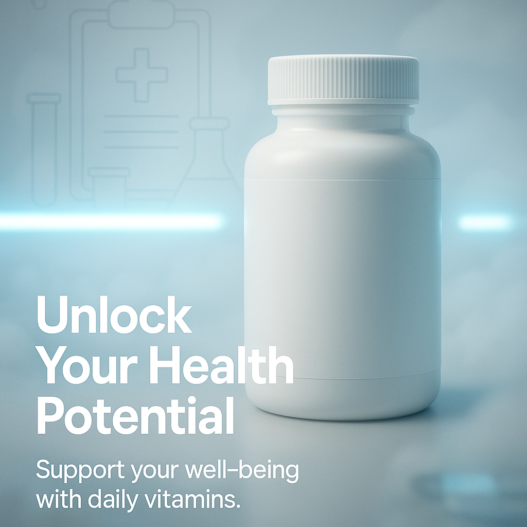 Sleek and modern mockup of a vitamin bottle, designed to promote health and wellness. Ideal for advertising health products with a clean aesthetic.