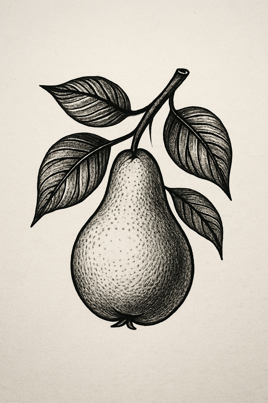 This is a hand-drawn illustration of a pear with intricate details on the fruit and leaves. It serves as a botanical art piece, suitable for print or digital use.