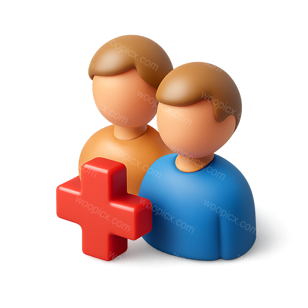 A 3D icon featuring two stylized figures, one in orange and one in blue, positioned next to a red medical cross. The design has a volumetric, isometric feel with a transparent background.