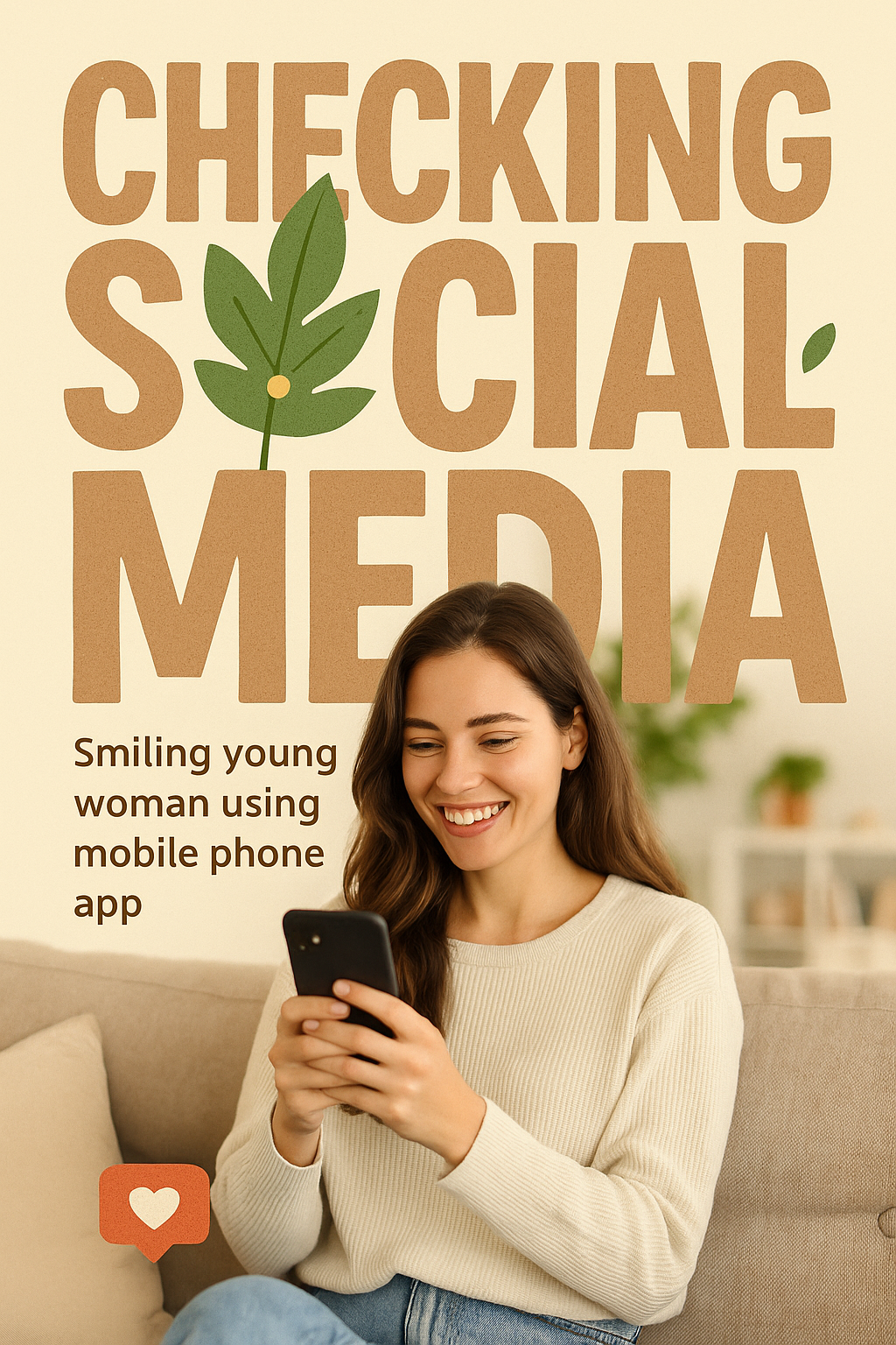 A warm and inviting social media themed image featuring a smiling woman using a mobile app, ideal for digital marketing or lifestyle content.