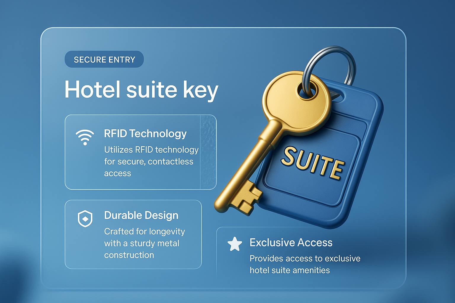 /Collection: /by davooda/Type: PNG/A 3D illustration of a hotel suite key showcasing RFID technology and durable design. The visual features a gradient background with integrated text blocks highlighting key features.