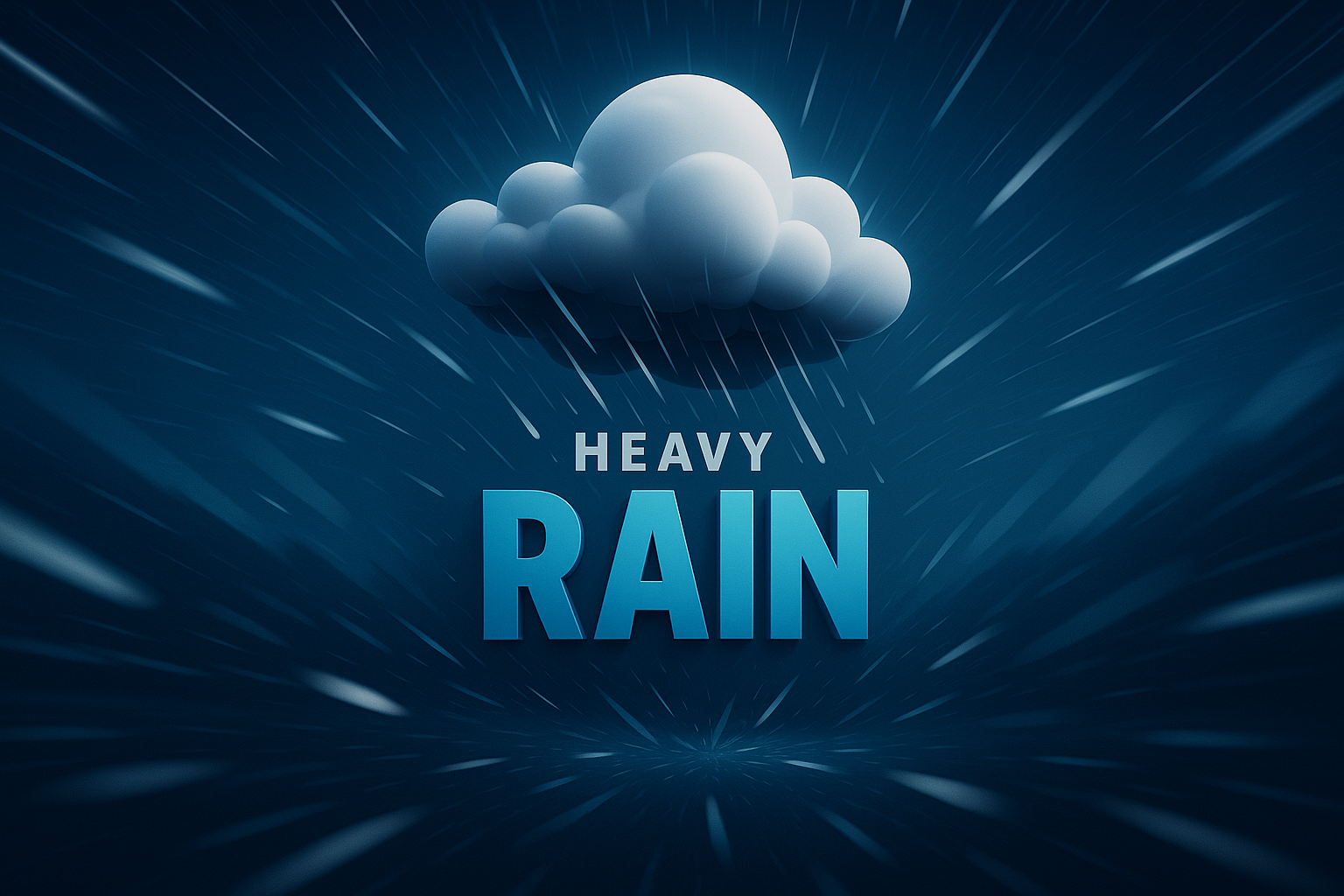 A striking 3D illustration of heavy rain with dynamic lines radiating from a cloud. The bold title 'HEAVY RAIN' stands out against a smooth gradient background, creating depth and movement.