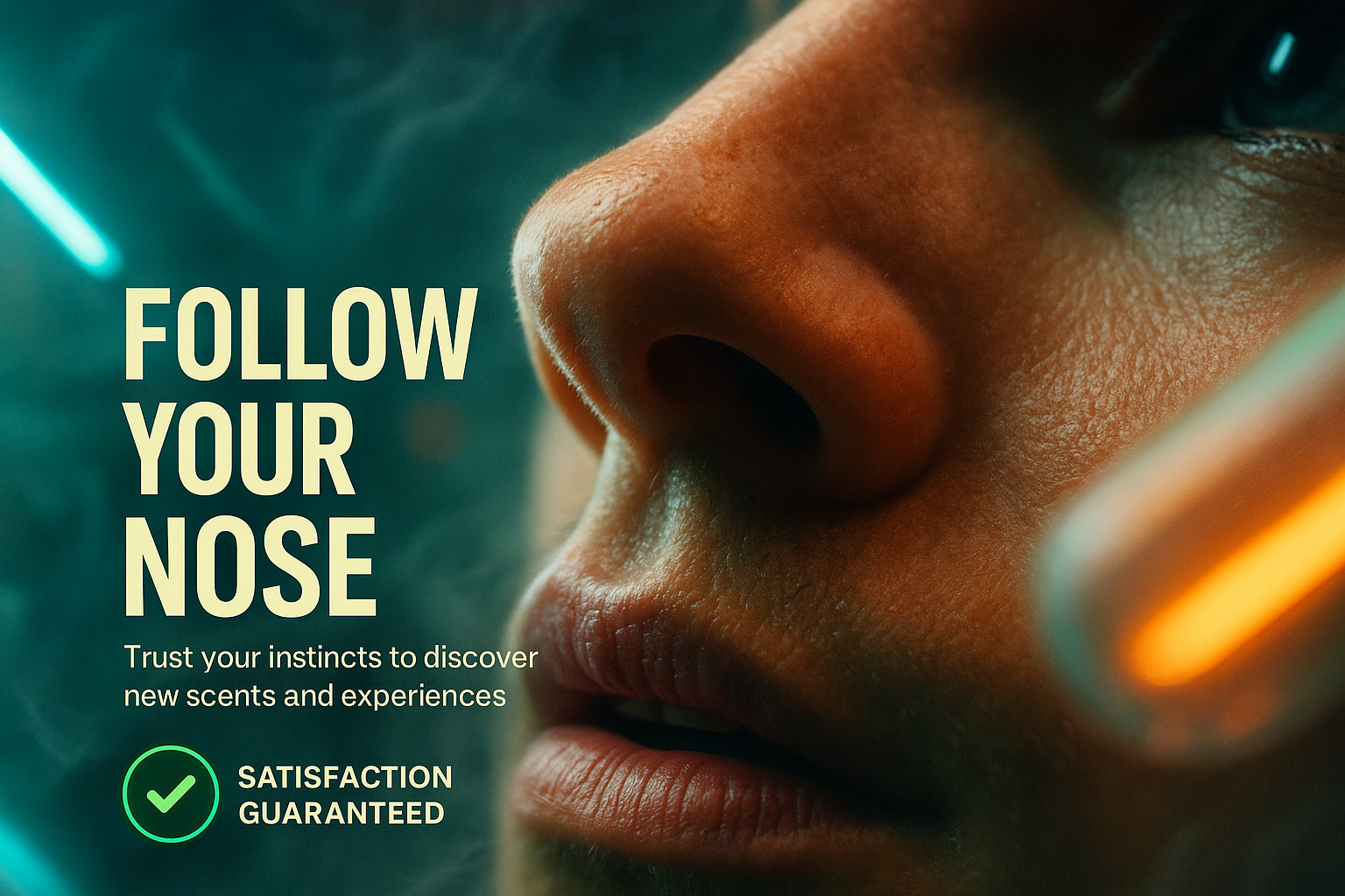 /Collection: /by davooda/Type: PNG/A captivating advertisement featuring a close-up of a nose with neon accents and a glowing aesthetic. The design includes a bold headline and a trust message, creating an immersive experience.