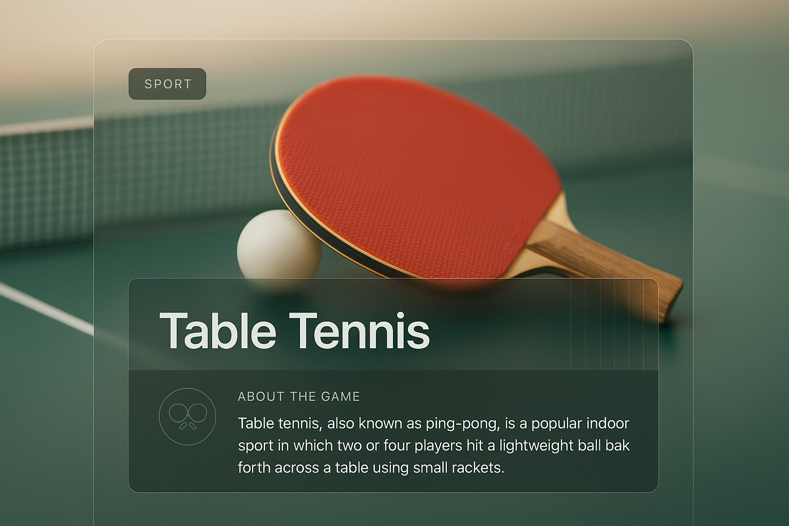 /Collection: /by davooda/Type: PNG/A visually appealing table tennis setup featuring a paddle and ball, enhanced with a stylish overlay containing information about the sport. The design emphasizes clarity and readability.