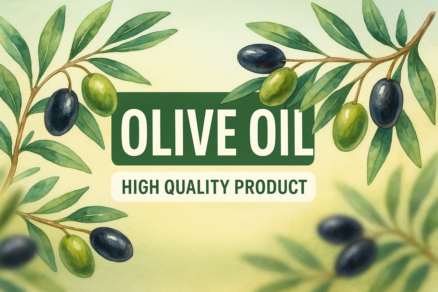 Charming product label design for olive oil featuring watercolor illustrations of olives and leaves, ideal for gourmet food marketing.