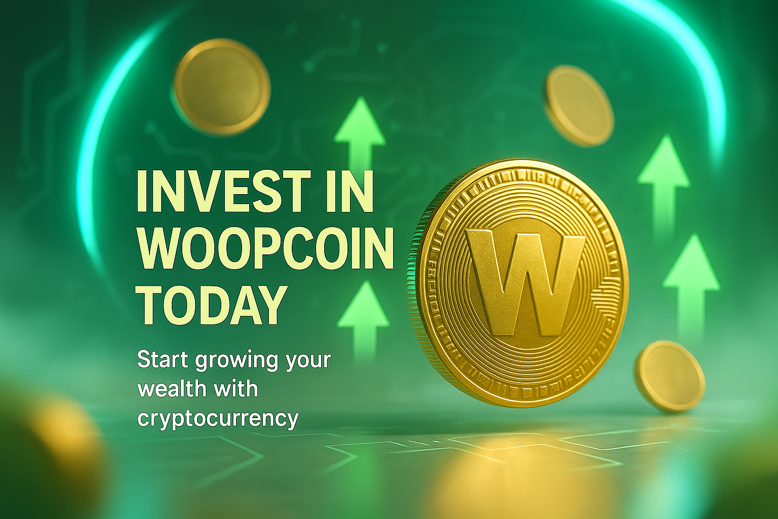 Vibrant promotional graphic encouraging investment in Woopcoin, featuring a 3D gold coin and upward arrows, ideal for cryptocurrency marketing.