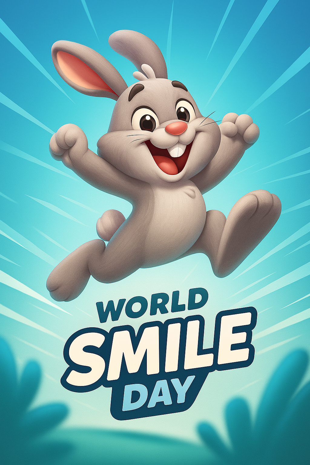 A cheerful cartoon bunny leaps joyfully against a vibrant blue background, celebrating World Smile Day. The design features dynamic rays emanating from the bunny, enhancing the playful atmosphere.