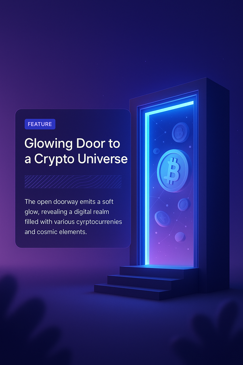 /Collection: /by davooda/Type: PNG/A glowing doorway opens into a vibrant crypto universe, showcasing digital realms filled with cryptocurrencies and cosmic features. The design is modern and immersive.