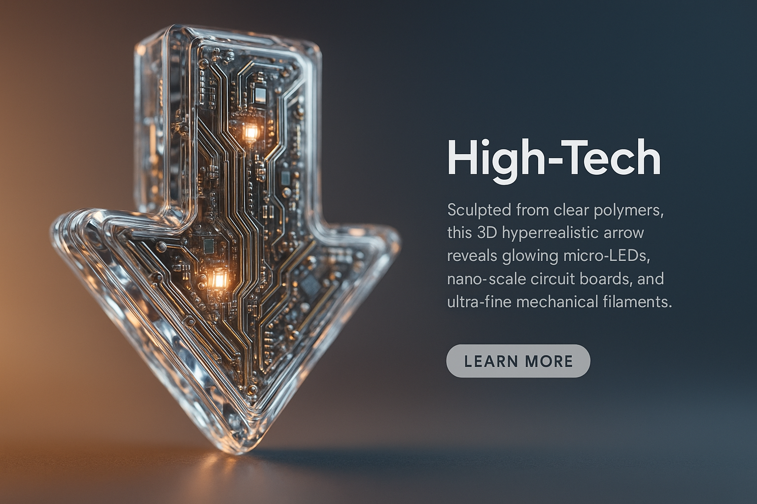 /Collection: /by davooda/Type: PNG/A hyperrealistic 3D arrow design showcases a glass-like surface filled with glowing micro-LEDs and intricate circuitry. The composition features soft lighting, emphasizing its high-tech aesthetics.