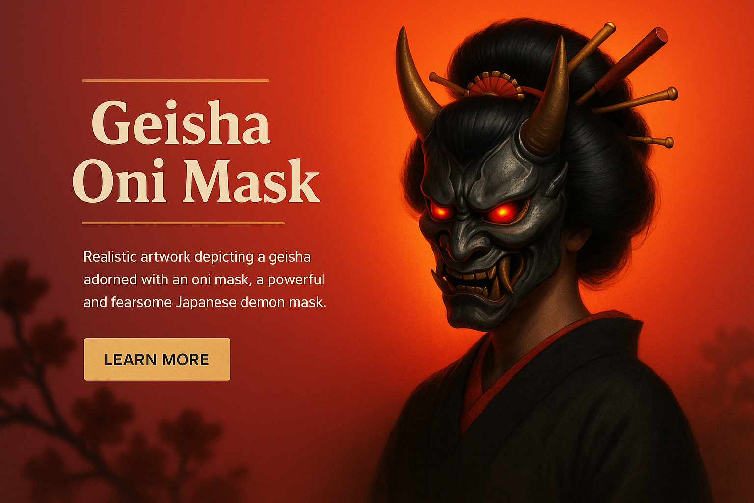 This digital artwork features a geisha wearing a striking oni mask, combining traditional Japanese aesthetics with a fierce, artistic flair. Ideal for cultural and artistic themes.