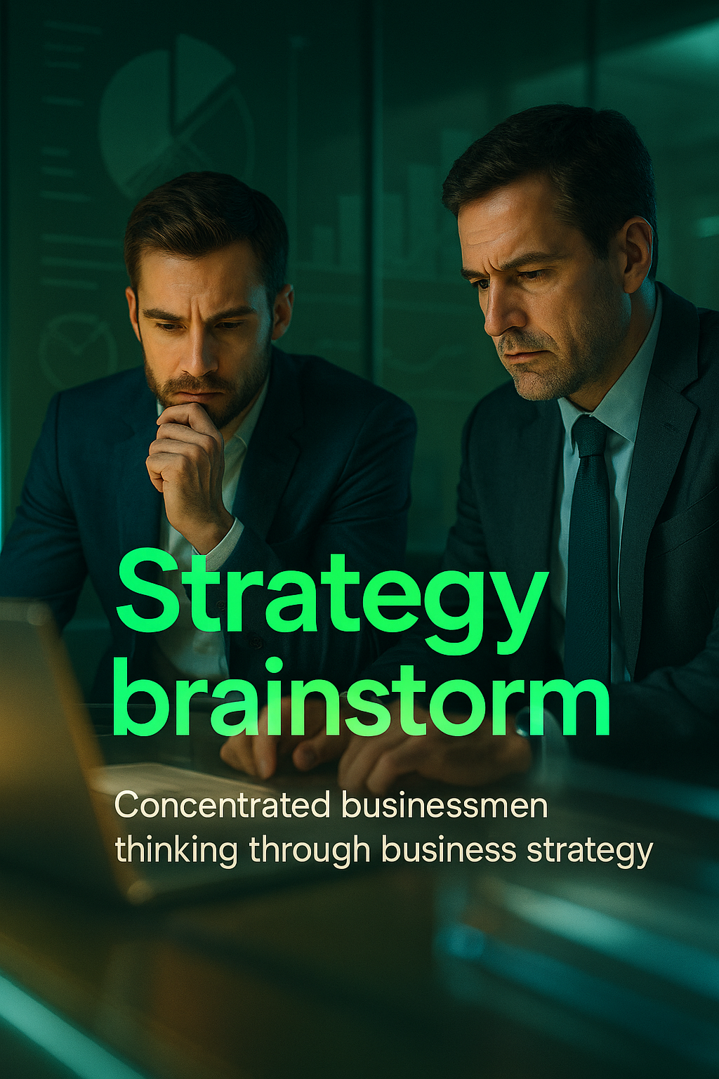 A professional image depicting two focused businessmen brainstorming strategies in a dimly lit office environment, perfect for corporate presentations and marketing materials.
