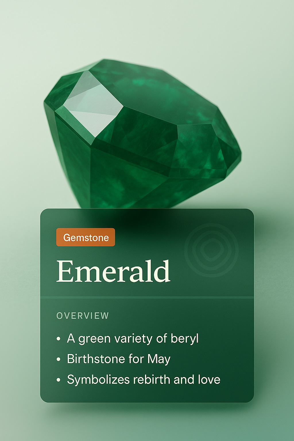 /Collection: /by davooda/Type: PNG/A visually appealing 3D emerald gemstone displayed with a modern information block. The block features a dark green background, clear text, and symbolic representations of its meaning.