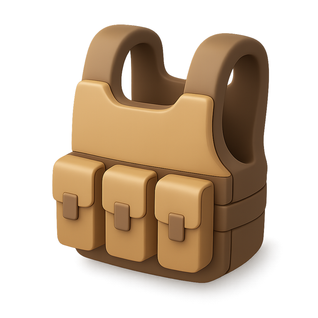 /Collection: /by davooda/Type: PNG/A stylized 3D icon of a tactical vest featuring three pouches, presented in a three-quarter isometric view with a smooth, volumetric design against a subtle gradient background.