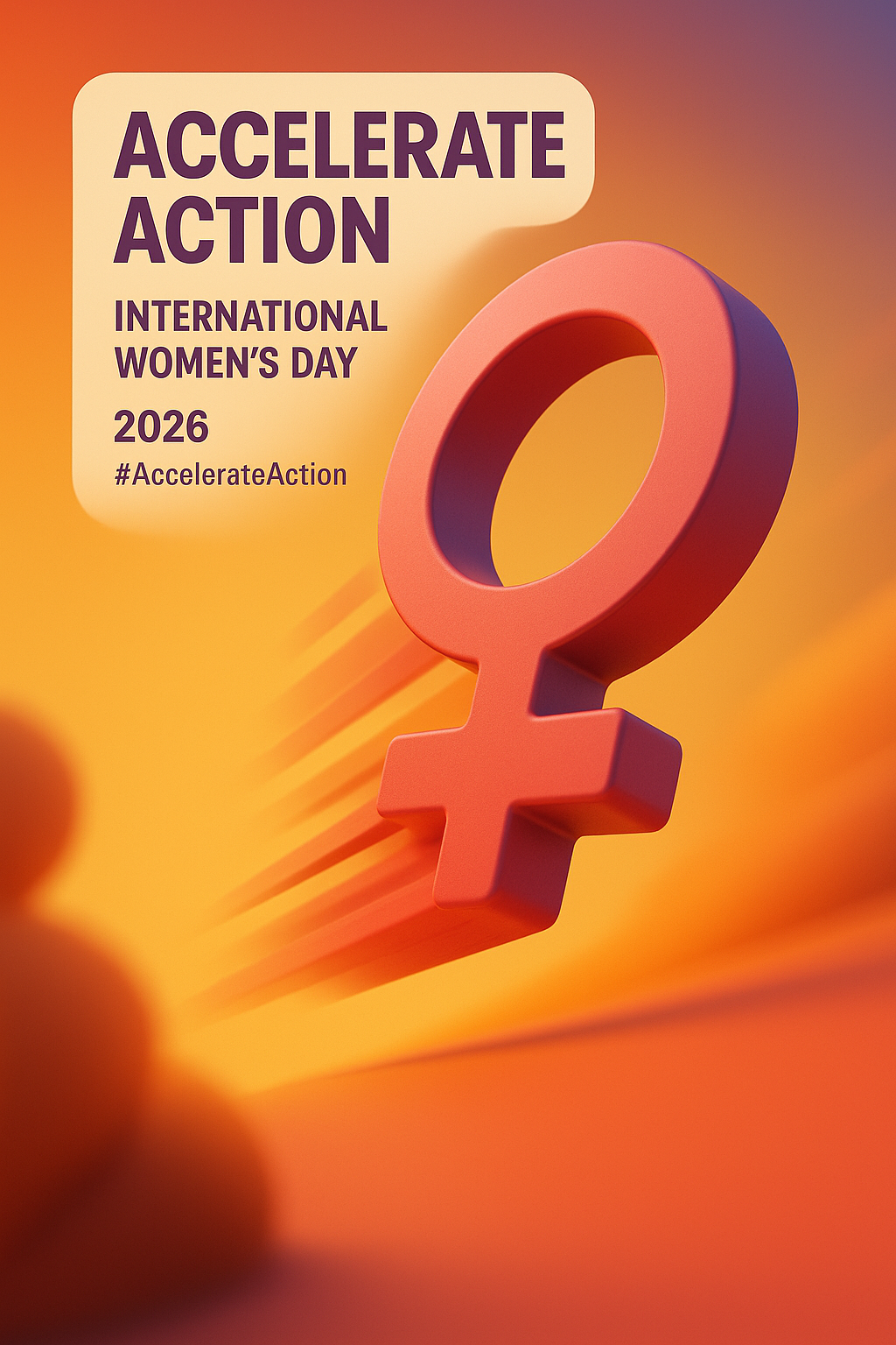 /Collection: /by davooda/Type: PNG/This is a promotional graphic for International Women's Day 2026, featuring a 3D female symbol against a vibrant gradient background. It aims to inspire action and awareness.