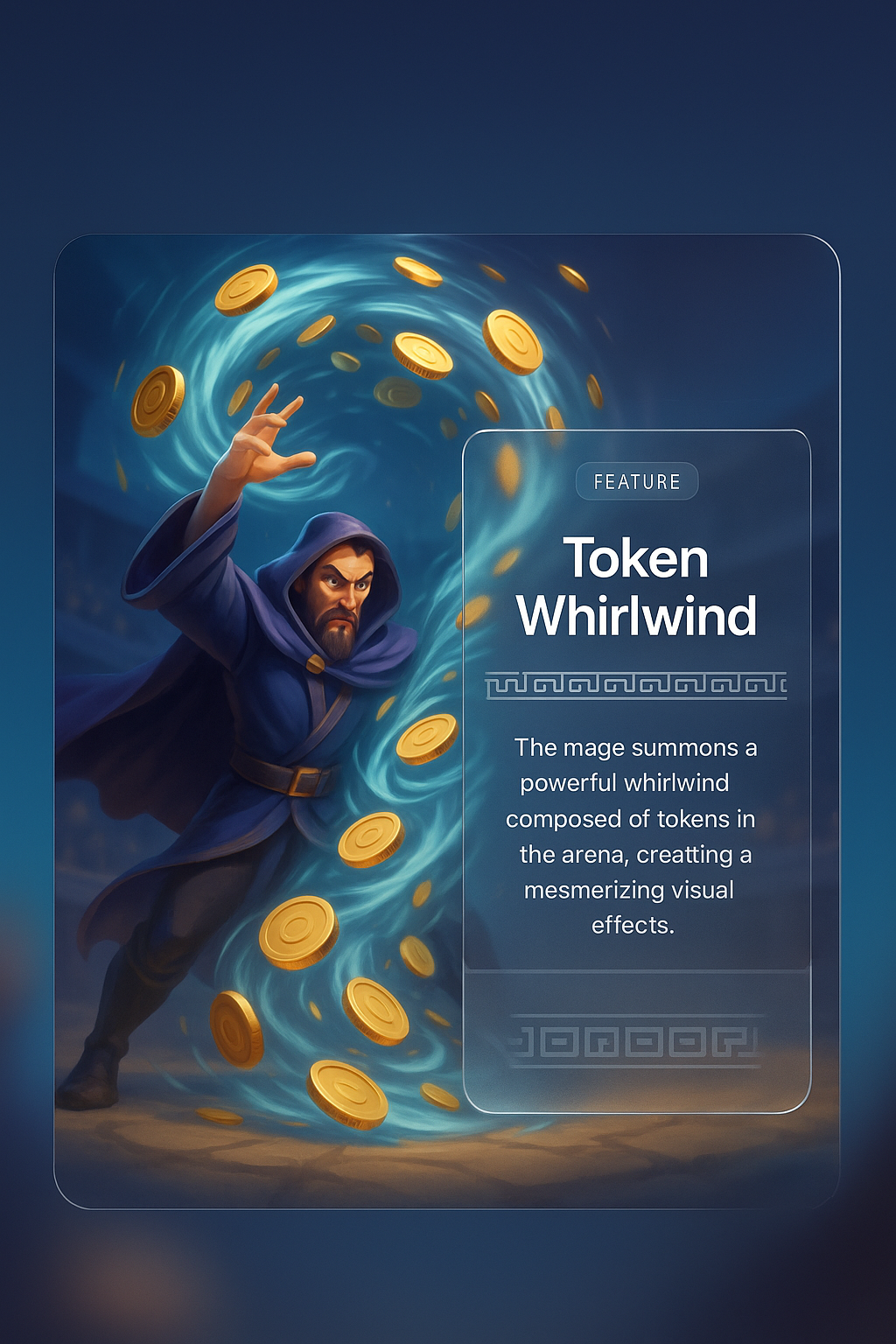 A mage conjures a dynamic whirlwind of tokens in an arena, surrounded by a visually captivating design. The image features a gradient background and informative text block.