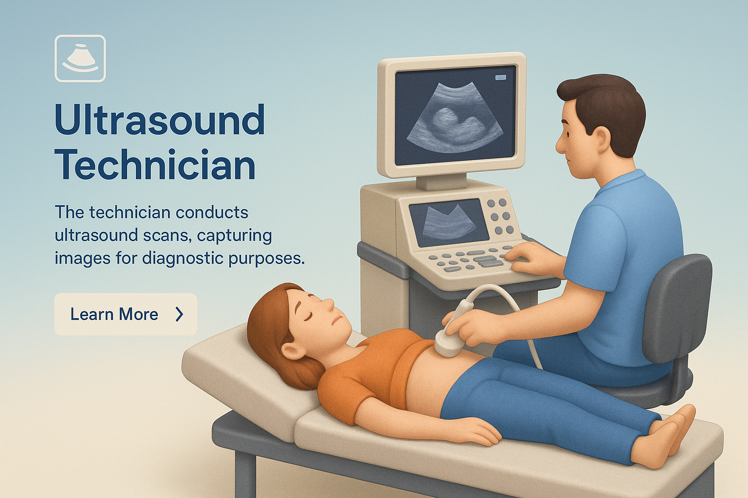 /Collection: /by davooda/Type: PNG/A detailed 3D illustration depicting an ultrasound technician performing a scan on a patient. The scene is zoomed out, showcasing the entire setup including the ultrasound machine and a clear background.